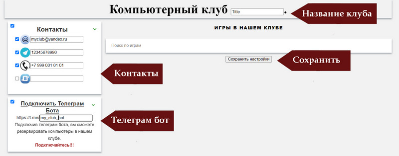 На странице клуба Ваши клиенты могут посмотреть - какие игры есть в вашем клубе. А так же ваша контактная информация.